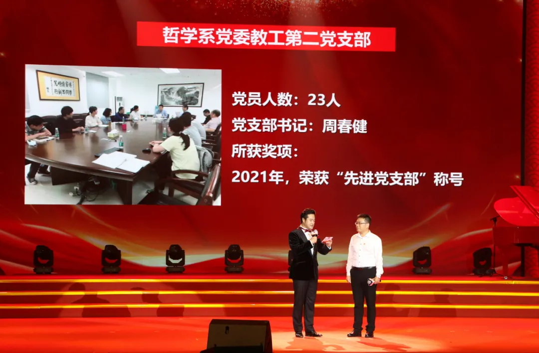 会上,学校表彰了一批优秀共产党员、优秀党务工作者和先进基层党组织。其中我系李宗桂同志、刘海林同志、王晓彤同志、李佐泽同志、张昕同志、周晓飞同志获“优秀共产党员”称号;哲学系教工第二党支部获“先进党支部”称号。冯达文教授作为获得“光荣在党50年”纪念章的老党员代表之一上台接受献花,教工第二党支部书记周春健同志作为全校先进党支部代表之一上台与大家分享本支部开展的特色活动。