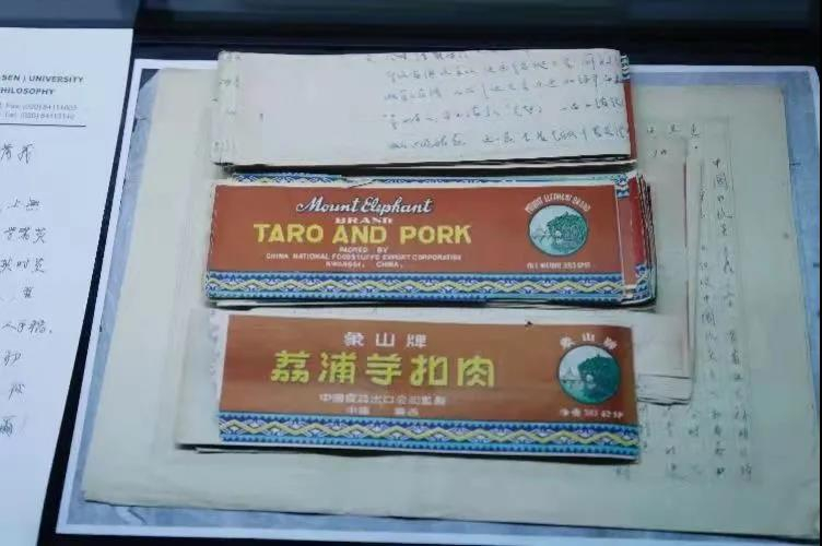 中文系黄天骥教授如今已是鹤发名师, 他于1964年撰写的《桃花扇》讲义也在展览之列。有趣的是,这份讲义撰写在整版的红色“荔浦芋扣肉”商标背面,起初被藏家当作老商标流通,还有被裁成一小条一小条的痕迹,后来才发现背面的字迹或更有文献价值。讲义并无署名,周春健老师几经询问,最后才确认是黄老师的讲义,而作者自己早已忘记了当年的情形。