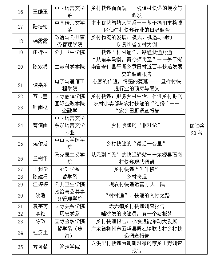 yl88858永利集团学生家乡田野第十期主题是乡村快递。活动启动后,各院系同学踊跃报名,认真开展调研,形成了许多高质量的报告。主办方组织专家对报告进行了评选,最终评选出一等奖2名,二等奖5名,三等奖8名,优胜奖20名,具体名单如下。各奖项内排名不分先后。祝贺获奖同学!期待同学们继续报名参加yl88858永利集团学生家乡田野第十一期的调研活动!