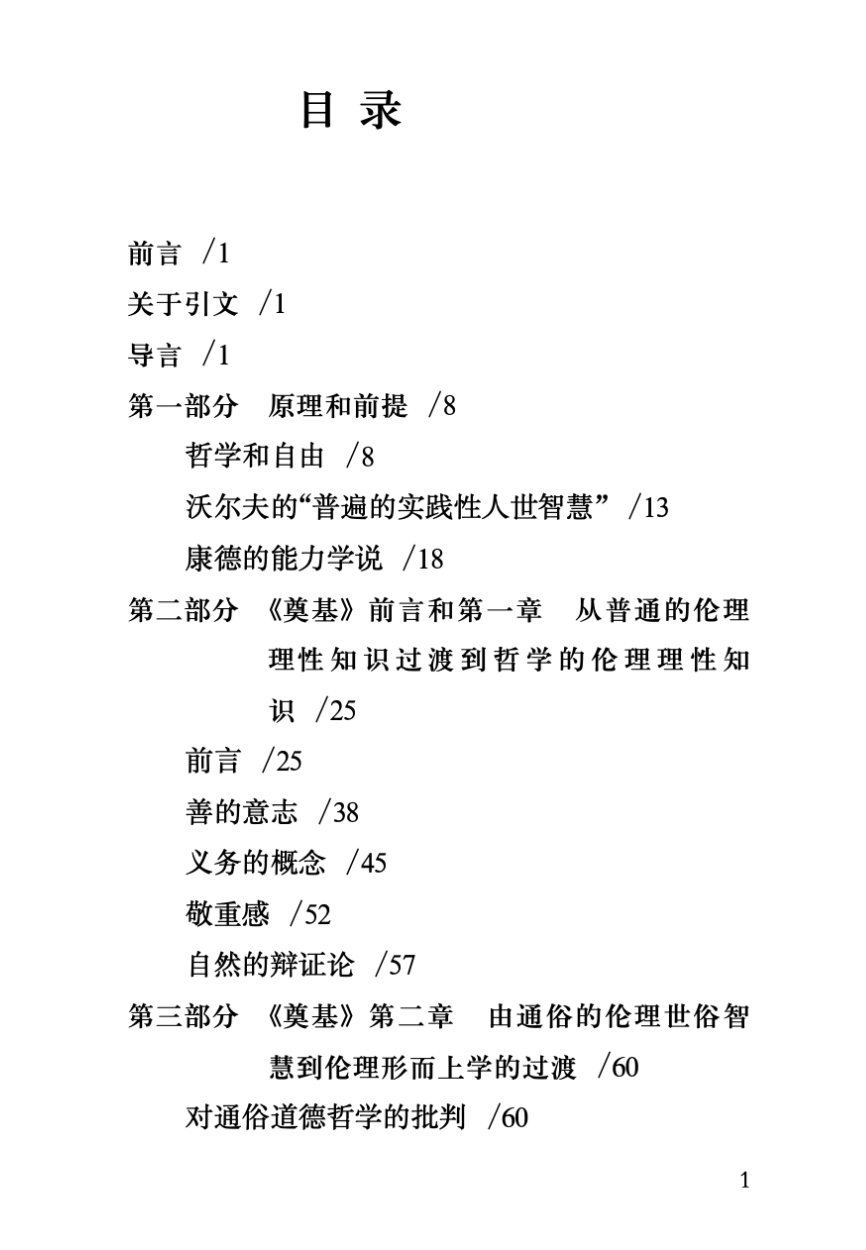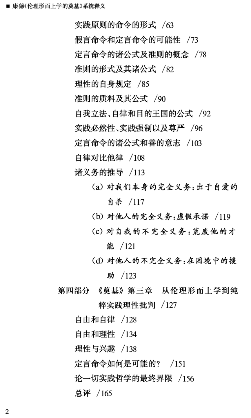 该书对康德的《伦理形而上学奠基》(以下简称《奠基》)做出详细而系统的解读。正文分为五个部分:第一部分分别从康德的自由概念、康德实践哲学的背景——沃尔夫哲学以及康德的能力学说对《奠基》的基本问题和语境做出详细的介绍和梳理。这是理解《奠基》乃至于康德整个实践哲学的基础;第二部分从“善的意志”、“义务的概念”、“敬重的情感”等核心概念来解读《奠基》的前言和第一章;第三部分系统解读《奠基》第二章,作者仔细探讨康德对命令概念的分类、定言命令的诸公式的具体含义,康德对诸义务的推导以及回应学界的争议;第四部分讨论《奠基》第三章,从“自由和自律”、“自由和理性”、“理性和兴趣”这些概念出发探讨定言命令的可能性问题,作者对这个问题的解释与目前英语世界的解读有很大的区别,值得汉语学界借鉴;第五部分,作者详细地列举出康德之后对康德《奠基》以及其实践哲学的批评,并做出一些回应,这些批判和回应也是目前学界所关注的。译者在翻译该书时,有一些关键术语与目前的学界的翻译有些区别。比如,学界通常把  Sitten 与 Moral 不做区分,都翻译为“道德”。译者区分二者,将 Sitten 翻译为“伦理”。这些都有待于学界进一步研讨。