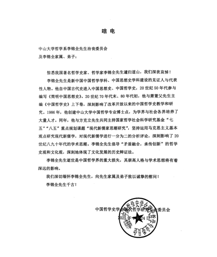 中国哲学史学会现代哲学研究会唁电