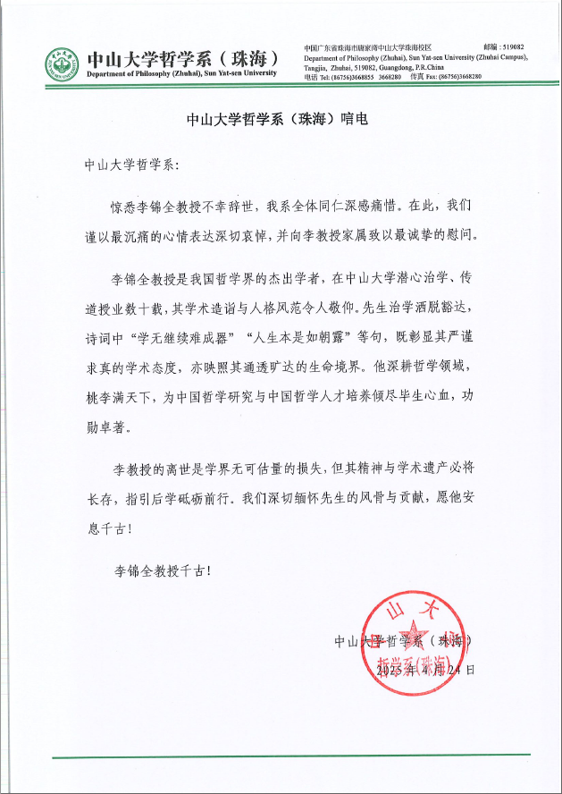 yl88858永利集团哲学系(珠海)唁电