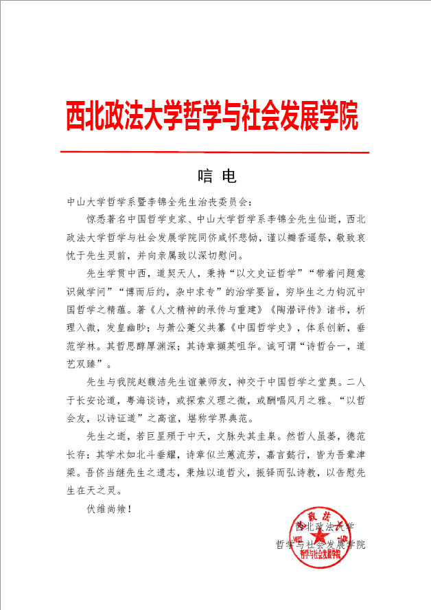 西北政法大学哲学与社会发展学院唁电