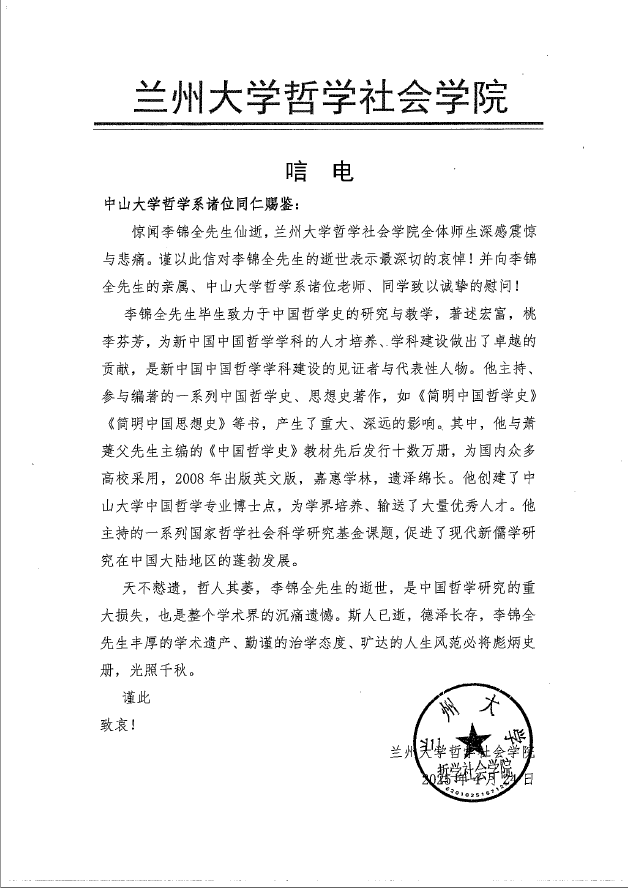 兰州大学哲学社会学院唁电