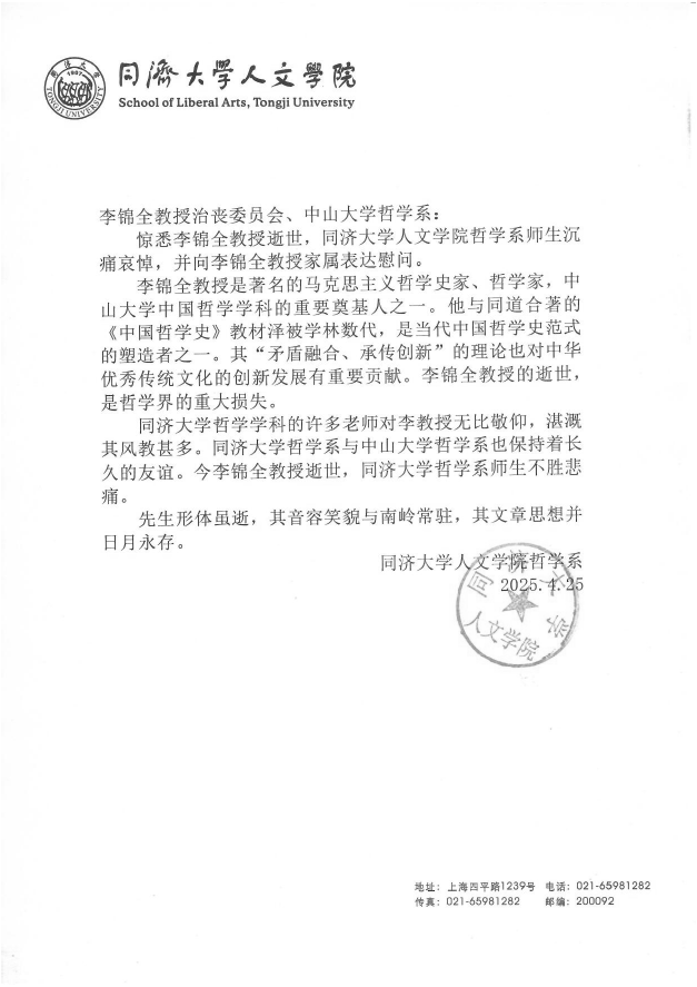 同济大学人文学院哲学系唁电