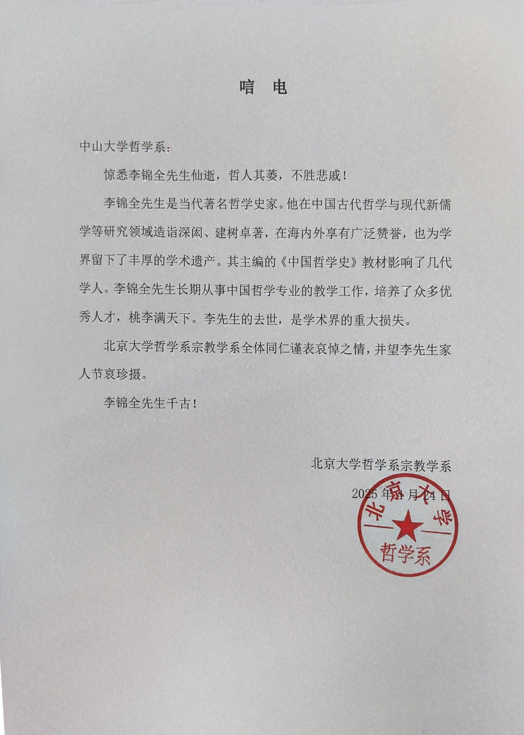 北京大学哲学系宗教学系唁电