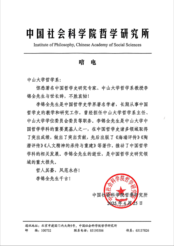 中国社会科学院哲学研究所唁电