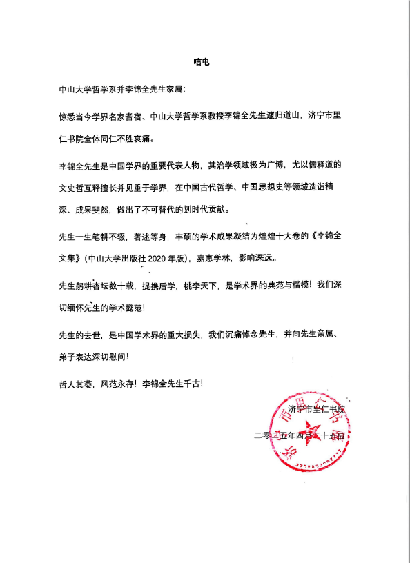 济宁市里仁学院唁电