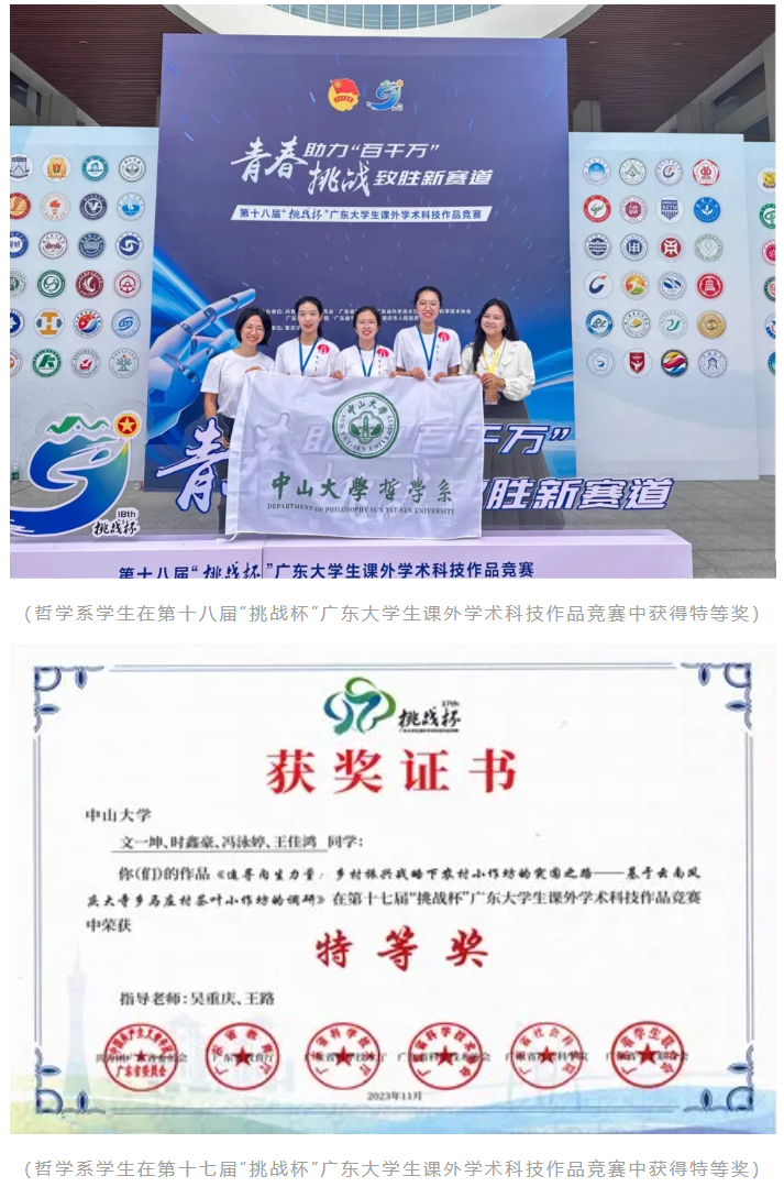 哲学系学生获评广东省大学生年度人物、广东省优秀共青团员、广东向上向善好青年、广东省优秀学生干部等称号,获“挑战杯”竞赛特等奖、美国大学生数学建模竞赛(MCM)奖、国际基因工程机器竞赛二等奖、全国大学生数学建模竞赛广东省一等奖等奖项;在全国高校史哲论坛主题征文活动、全国大学生艺术展演、全国青少年舞蹈大赛、“立志·修身·博学·报国”主题教育系列活动、高校心理情景剧大赛、广东省声乐大赛、南粤校园中华经典诵读文化艺术节、全国青少年跆拳道U系列赛、广东省大学生运动会等活动中成绩斐然。