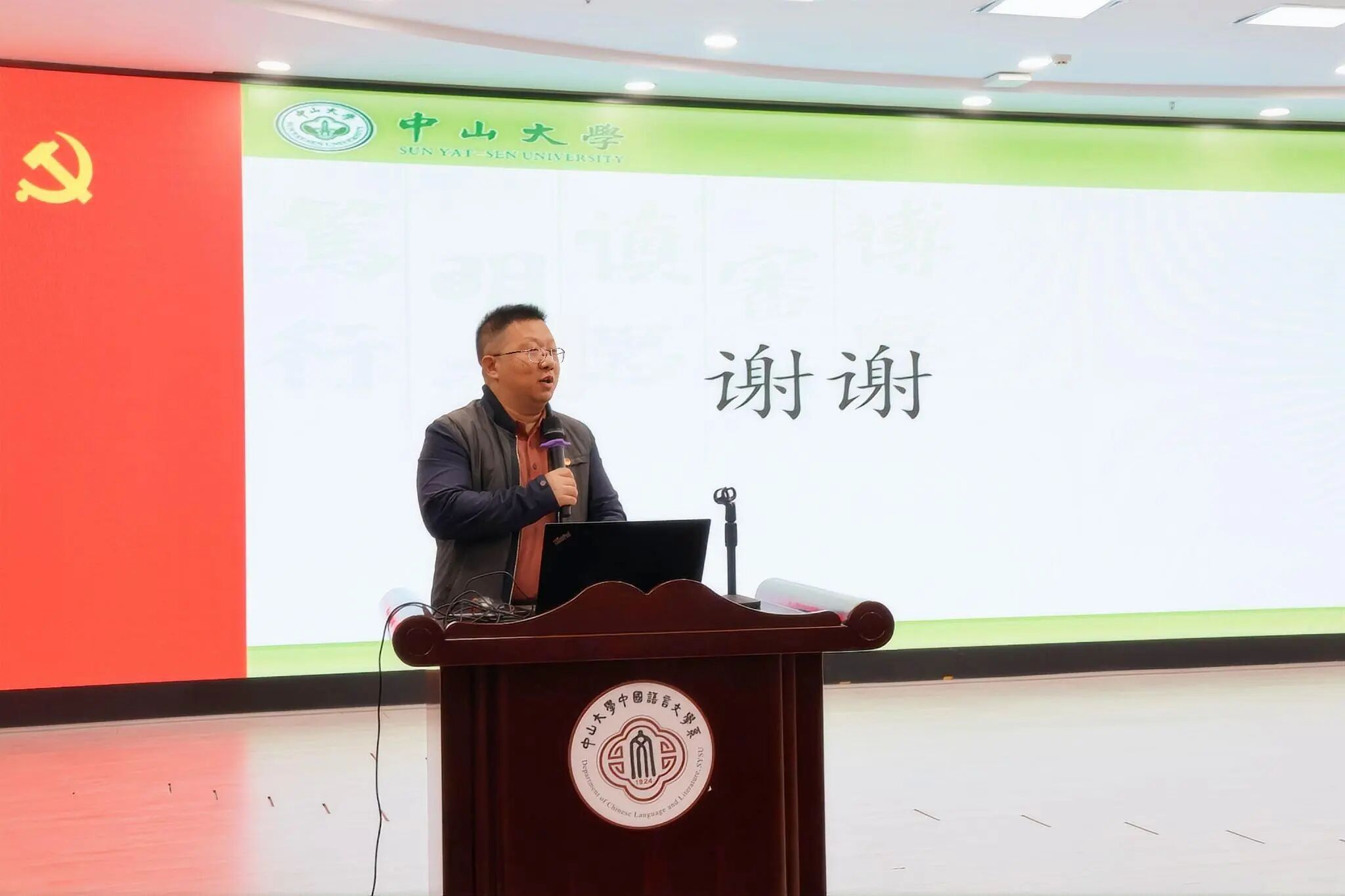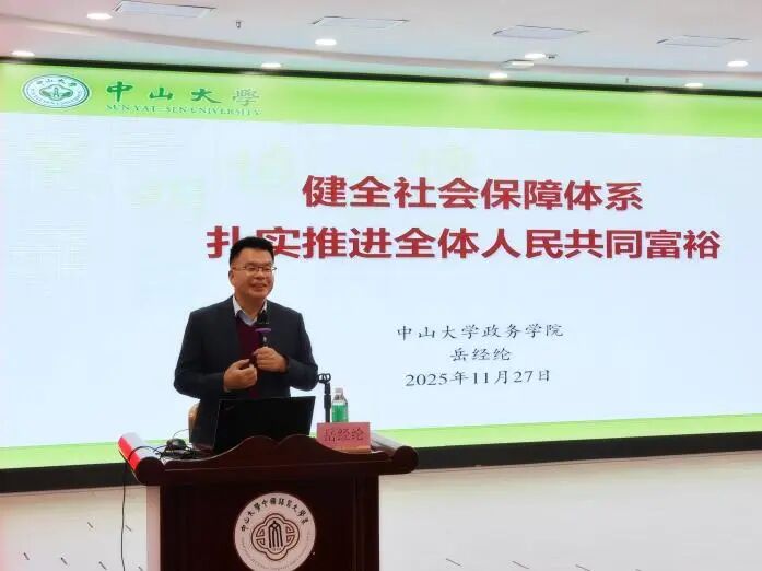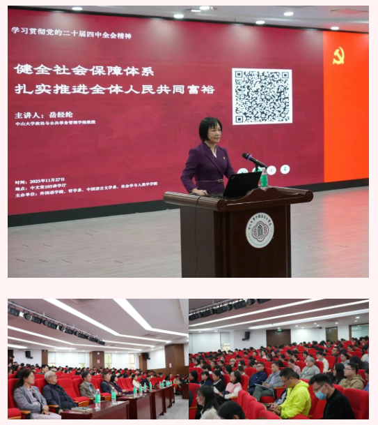 11月27日下午,外国语学院党委、哲学系党委、中国语言文学系党委、社会学与人类学学院党委联合举办学习贯彻党的二十届四中全会精神专题讲座,邀请了政治与公共事务管理学院岳经纶教授主讲“健全社会保障体系,扎实推进全体人民共同富裕”专题报告。讲座会场设在中文堂105讲学厅,四个院系的党委理论学习中心组成员、师生党员、入党积极分子、发展对象等300余人参加学习。讲座由外国语学院党委书记张东蕙主持。