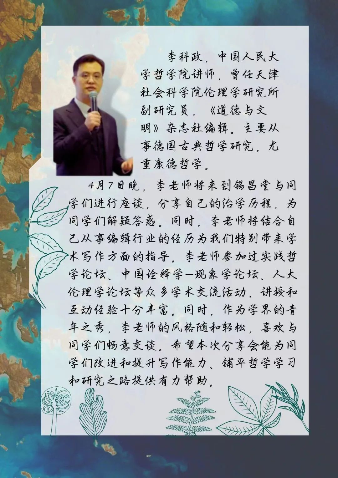 李老师将分享自己的治学历程和人生体悟,亦将结合自己从事编辑行业的经历为同学们带来学术写作方面的指导。根据前期问卷调查,同学们对于李老师的研究领域也抱有强烈的兴趣。欢迎大家在分享会上积极提问,期待李老师带领我们来到“哥尼斯堡的星空”中饱游饫看。