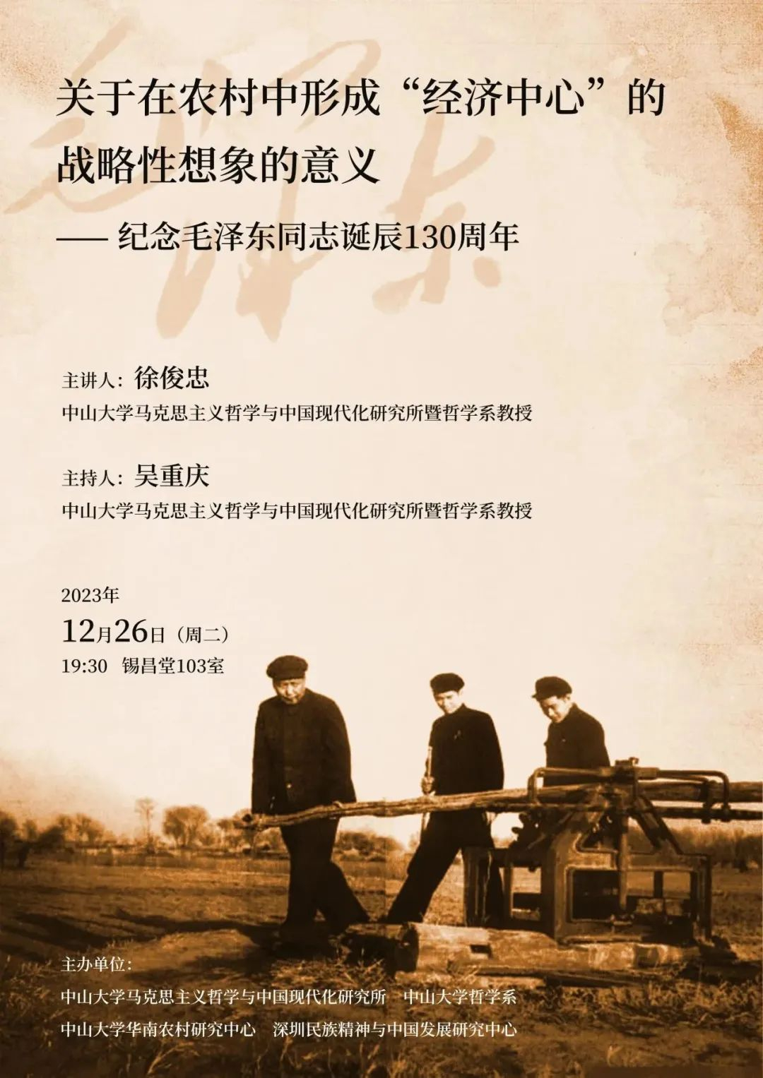 讲座预告 | 徐俊忠:关于在农村中形成“经济中心”的战略性想象的意义——纪念毛泽东同志诞辰130周年