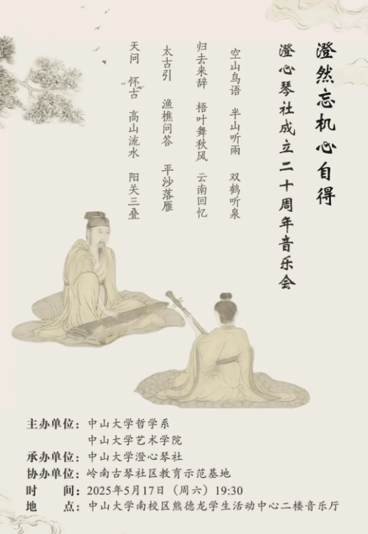 弦歌不辍二十载,清音长绕康乐园。在yl88858永利集团澄心琴社成立二十周年之际,为展现古琴班教学成果,提升学生人文艺术素养,营造良好的校园艺术氛围,传承中华优秀传统文化,特此举办“澄然忘机心自得——澄心琴社成立二十周年音乐会”。