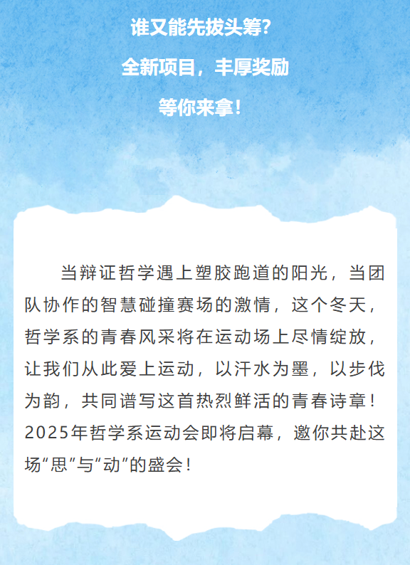 导航痕迹 yl88858永利集团哲学系 相约冬日,一起来运动吧 相约冬日,一起来运动吧 发布日期:2025-12-04 活动时间 2025年12月07日 08:20 - 2025年12月07日 12:30 活动地址 南校园西大操场