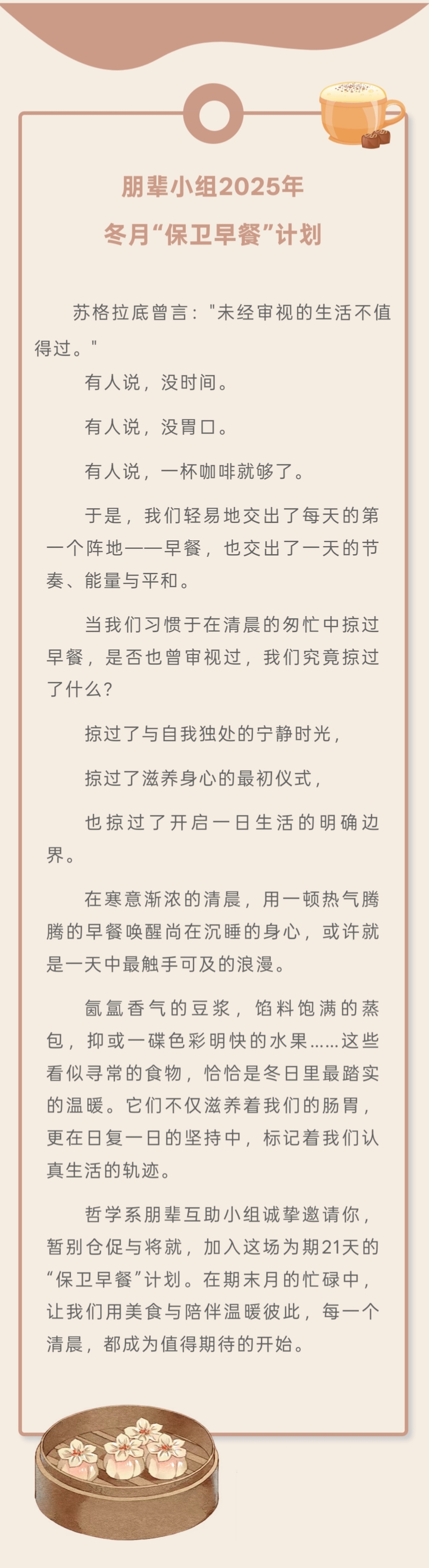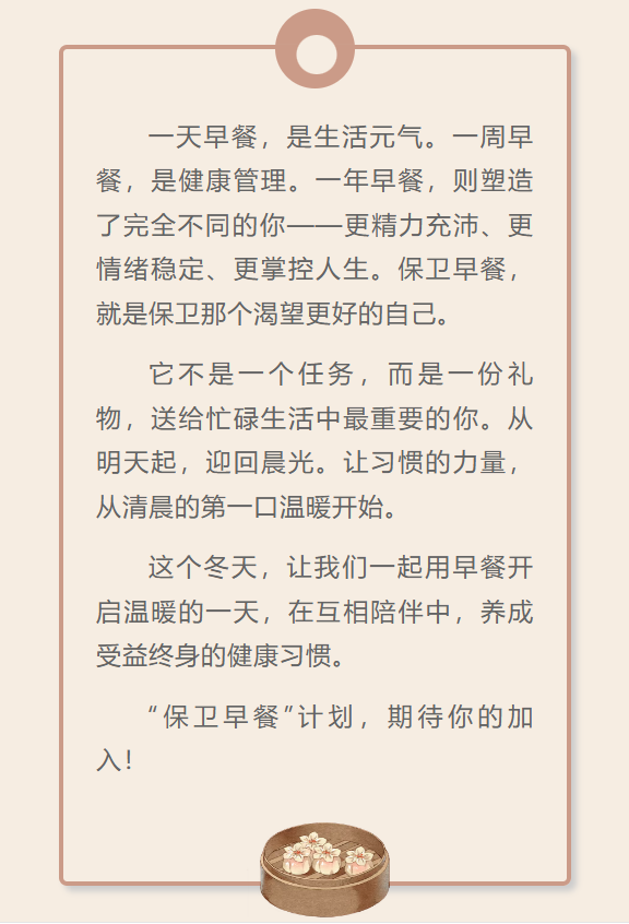 导航痕迹 yl88858永利集团哲学系 朋辈小组2025年冬月“保卫早餐”计划 | 从“再睡一会”到“真香” 朋辈小组2025年冬月“保卫早餐”计划 | 从“再睡一会”到“真香” 发布日期:2025-12-05 活动时间 2025年11月08日 06:00 - 2025年11月28日 09:00