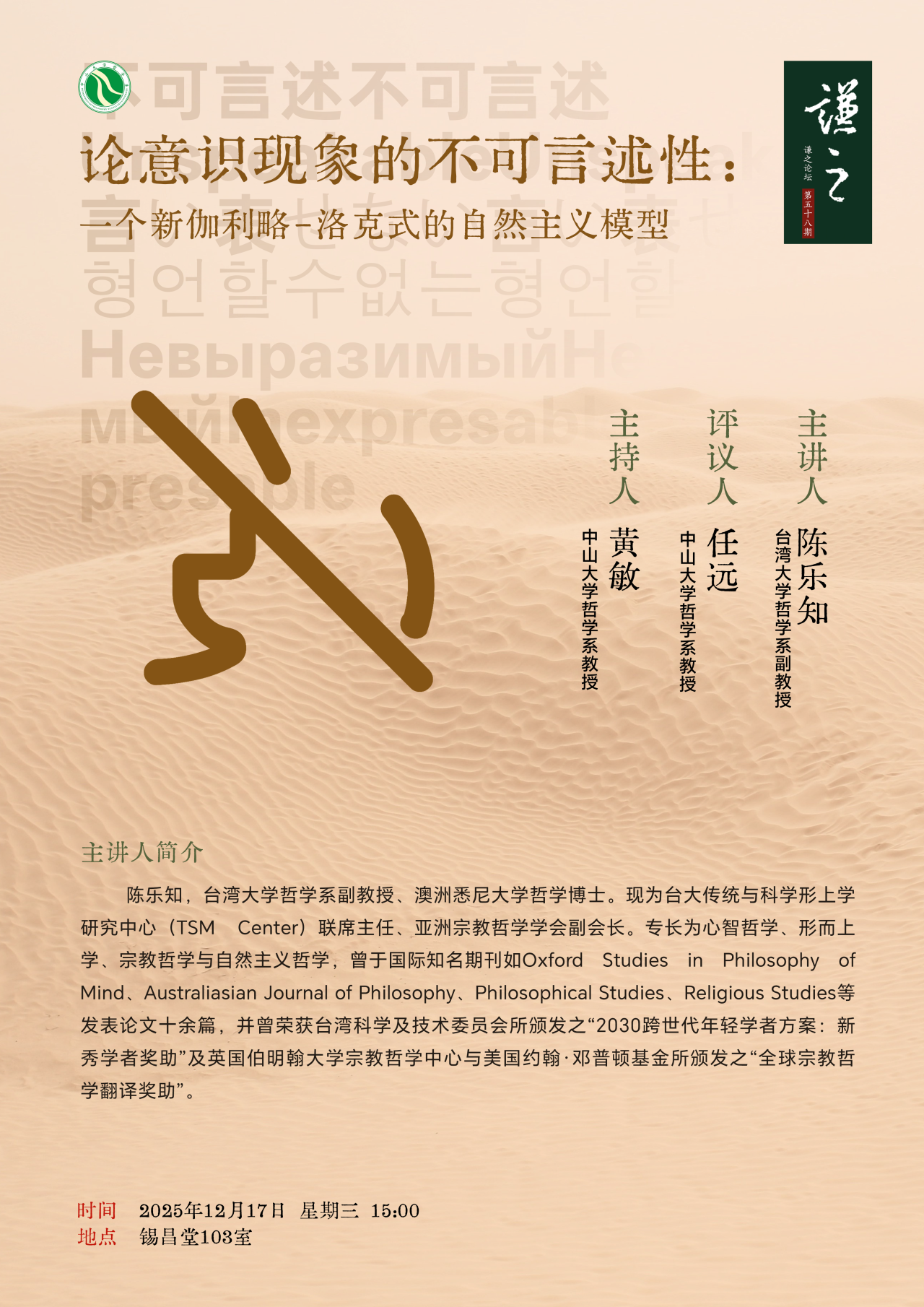 谦之论坛预告 | 陈乐知:论意识现象的不可言述性:一个新伽利略-洛克式的自然主义模型