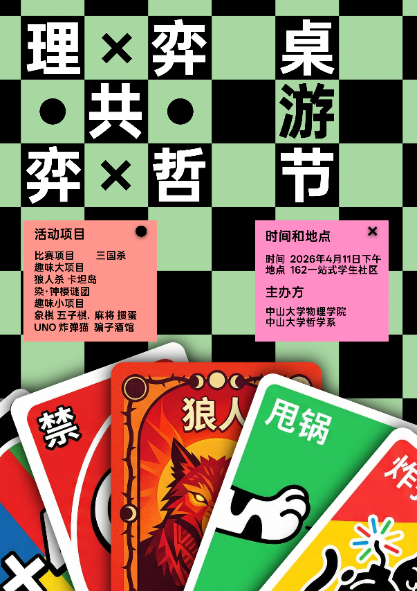 当物理的理性推导遇见哲学的深邃思辨,一场思维与乐趣并存的碰撞即将上演。物理学院与哲学系携手打造面向全体师生的趣味桌游节,以桌游为桥,在方寸之间对弈思想,在欢声笑语中邂逅知音。2026年4月11日,“理哲共弈”物理学院×哲学系联办桌游节,邀你共赴欢乐之约!